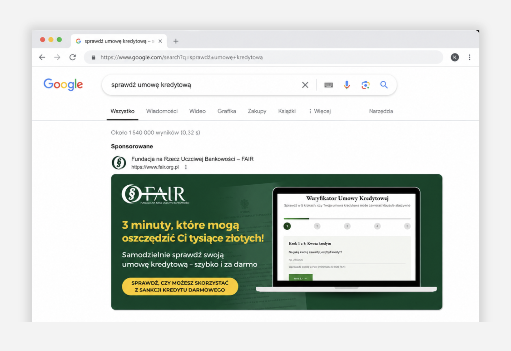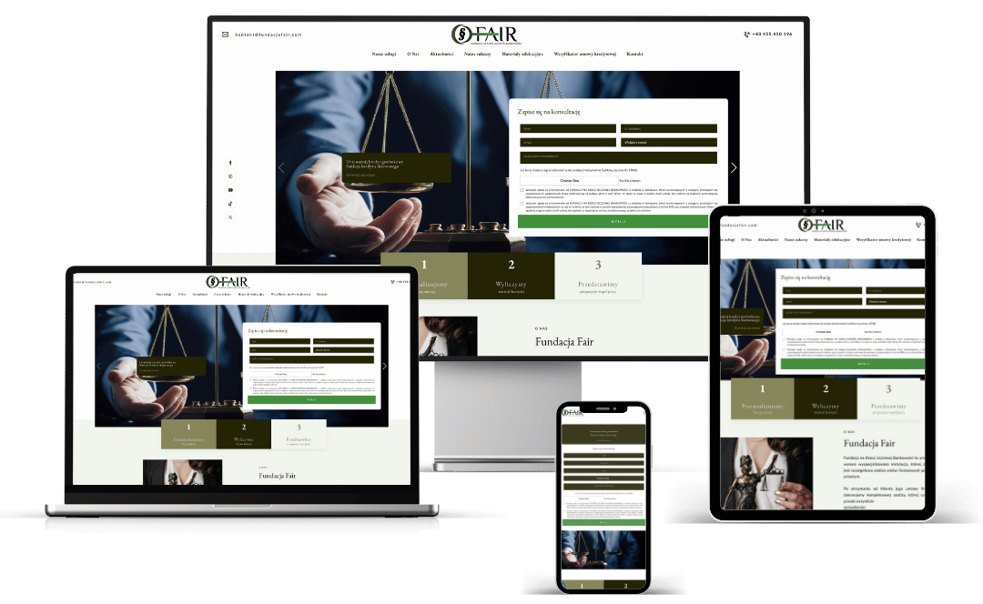 Branża prawna i finansowa opiera się na bezwzględnym zaufaniu. Standardowe wizytówki kancelarii to dziś za mało, żeby skutecznie konkurować o klienta w internecie. Naszym zadaniem dla Fundacji FAIR było stworzenie platformy, która wykracza poza suchą prezentację oferty – łącząc merytoryczne doradztwo z zaawansowaną architekturą lejka sprzedażowego. Przyjęta strategia zakładała budowę hubu edukacyjnego, który zoptymalizuje pozyskiwanie leadów z płatnych kampanii reklamowych i trwale zbuduje pozycję ekspercką w wysoce konkurencyjnym sektorze.